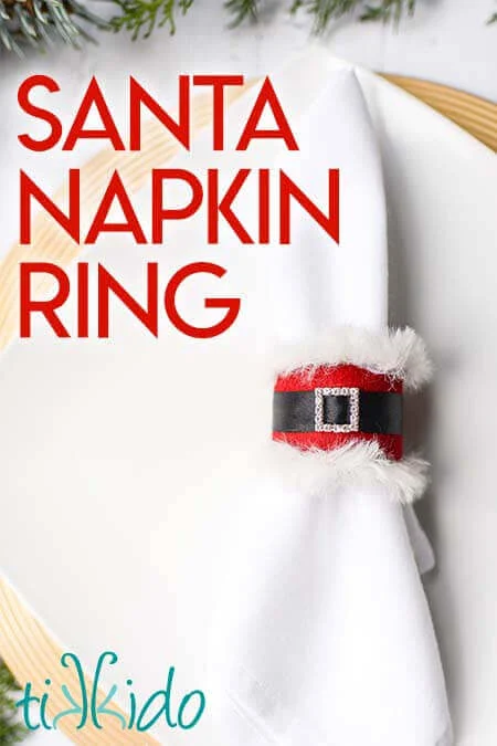 Make this Santa napkin ring to decorate your Christmas table with some felt, a toilet paper tube, some fuzzy yarn and some ribbon. It's an easy DIY napkin ring for Christmas that looks festive and fun.