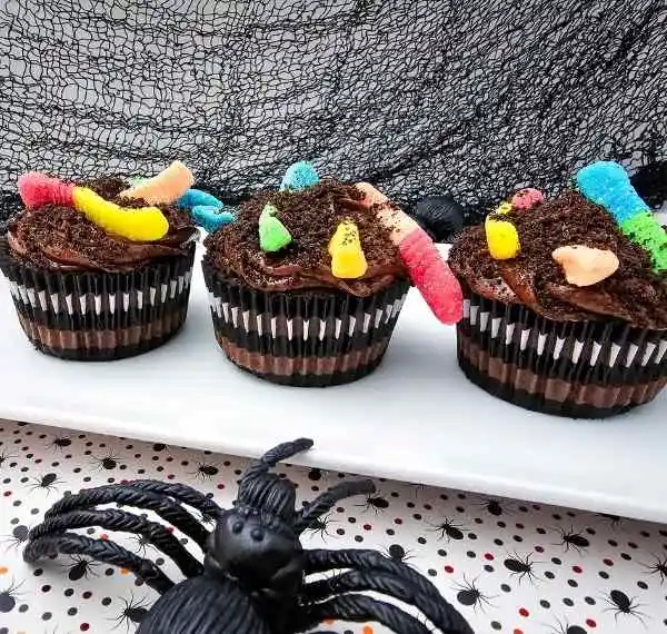 Worms and Dirt Cupcakes are a playful dessert perfect for Halloween. The cookie “dirt” adds a fun crunch, while the gummy worms give a spooky-cute touch.